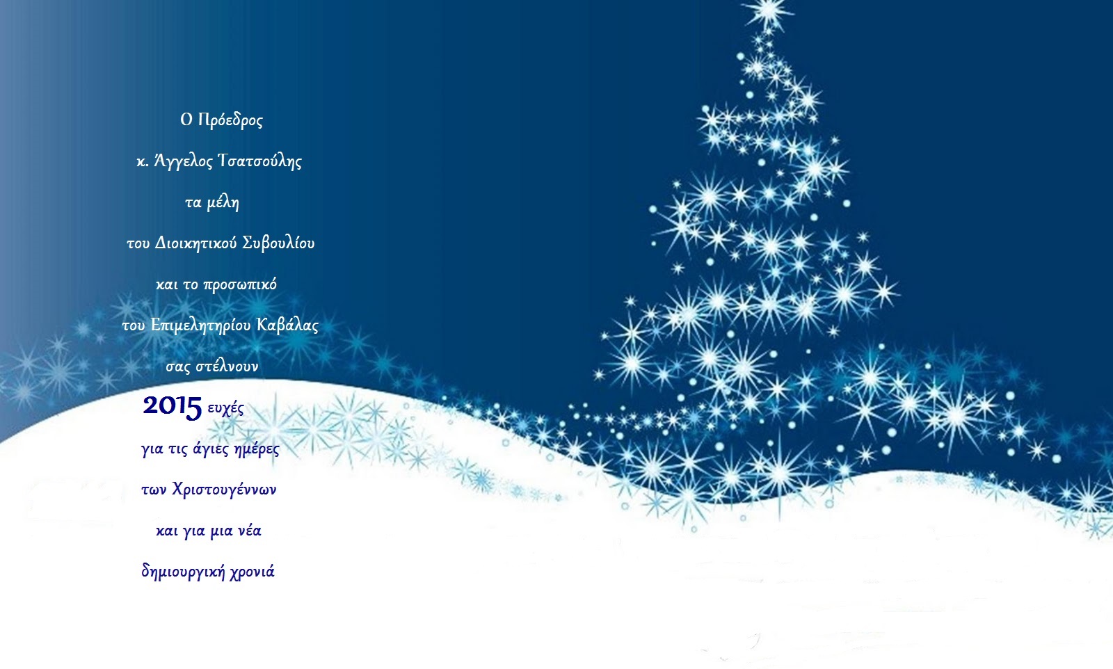 Ο Πρόεδρος κ. Άγγελος Τσατσούλης τα μέλη του Διοικητικού Συμβουλίου και το προσωπικό του Επιμελητηρίου Καβάλας σας στέλνουν 2015 ευχές για τις άγιες μέρες των Χριστουγέννων και για μια νέα δημιουργική χρονιά!!
