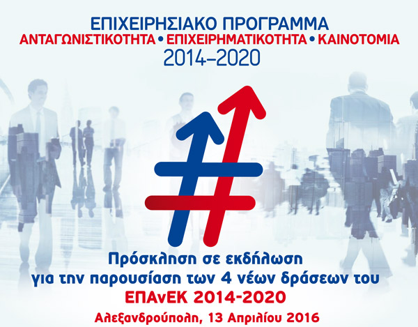 Το Επιμελητήριο Καβάλας μέλος του δικτύου Enterpise Europe Network, σας ενημερώνει ότι θα πραγματοποιηθεί ανοιχτή ενημερωτική εκδήλωση για την παρουσίαση των 4 νέων δράσεων του ΕΠΑνΕΚ 2014-2020, την Τετάρτη 13 Απριλίου 2016 και ώρα 16:00 στο Επιμελητήριο Έβρου, Λ. Δημοκρατίας 307, Αλεξανδρούπολη.