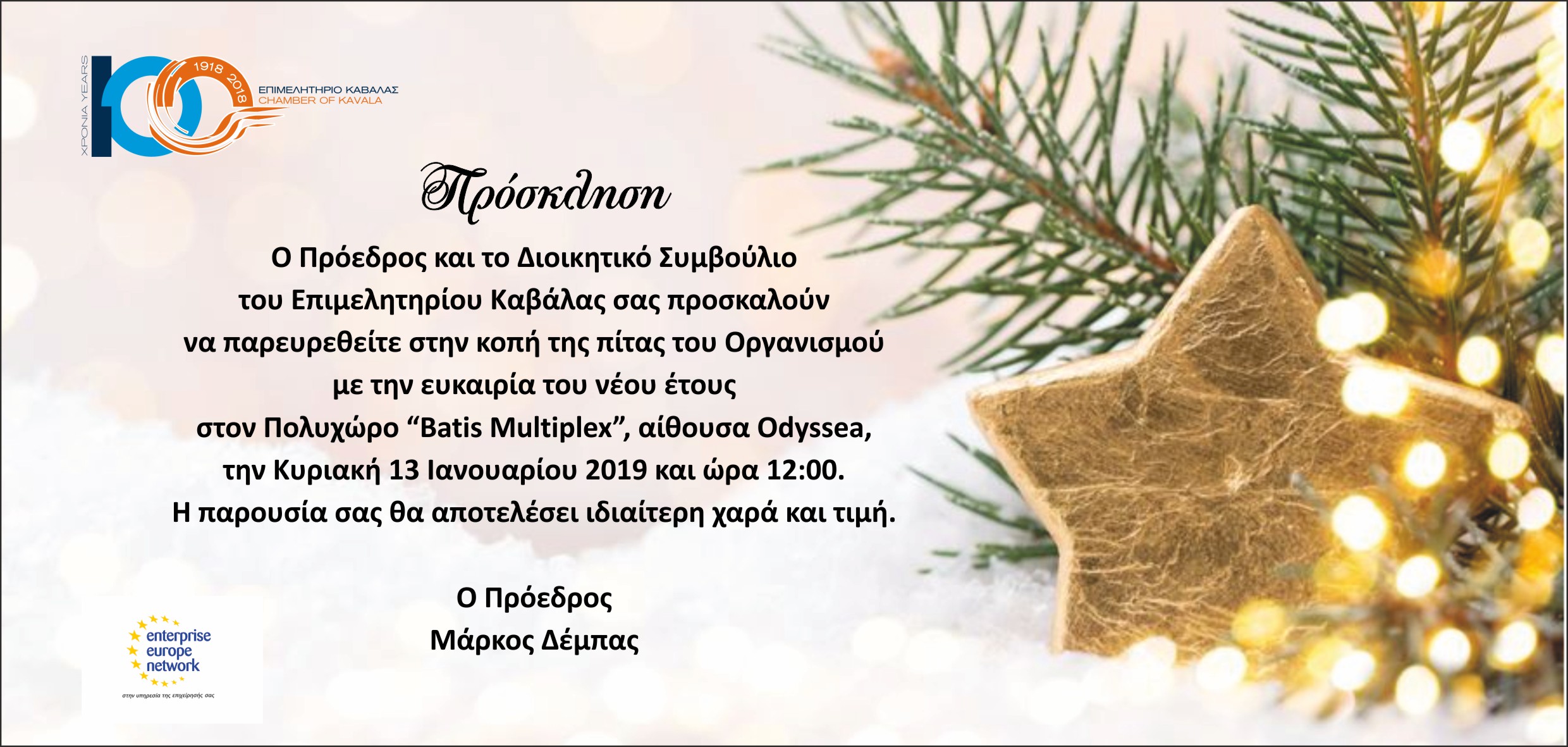 Πρόσκληση κοπής πρωτοχρονιάτικης πίτας Επιμελητηρίου Καβάλας