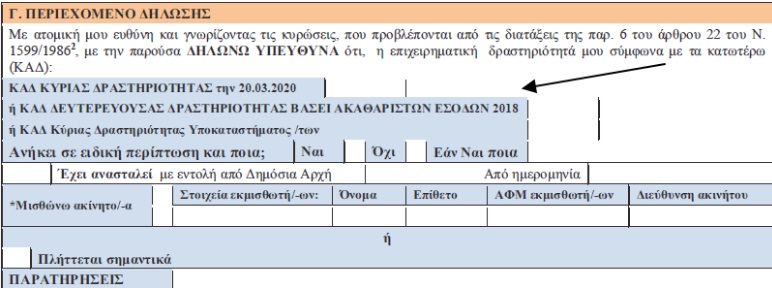 - Το έντυπο μπορεί να συμπληρώνεται από τους ανωτέρω ακόμα και αν δεν απασχολούν προσωπικό ή δεν έχουν ενεργοποιημένο ΑΜΕ, μόνο ως προς τα πεδία που αφορούν την έκπτωση του ενοικίου της επαγγελματικής μίσθωσης εφόσον η λειτουργία τους έχει ανασταλεί βάσει ΚΑΔ (κύριας δραστηριότητας την 20.3.2020 ή δευτερεύουσας δραστηριότητας βάσει ακαθάριστων εσόδων ή κύριας δραστηριότητας υποκαταστήματος /των) ή προσωρινά απαγορευτεί με εντολή δημόσιας αρχής