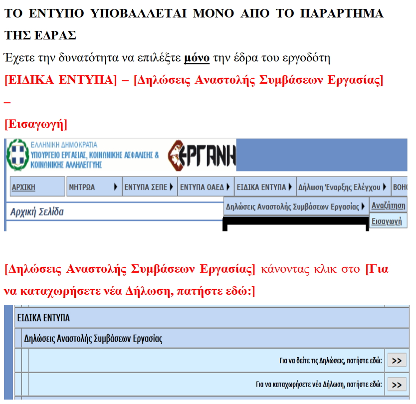 Η Υποβολή της Δήλωσης Αναστολής Συμβάσεων Εργασίας πραγματοποιείται από την αρχική οθόνη του ΠΣ ΕΡΓΑΝΗ επιλέγοντας από τομενού στο πάνω μέρος της οθόνης [ΕΙΔΙΚΑ ΕΝΤΥΠΑ]–[Δηλώσεις Αναστολής Συμβάσεων Εργασίας]–[Εισαγωγή]ή εναλλακτικά από την ενότητα [Δηλώσεις Αναστολής Συμβάσεων Εργασίας] κάνοντας κλικ στο [Για να καταχωρήσετε νέα Δήλωση, πατήστε εδώ:].